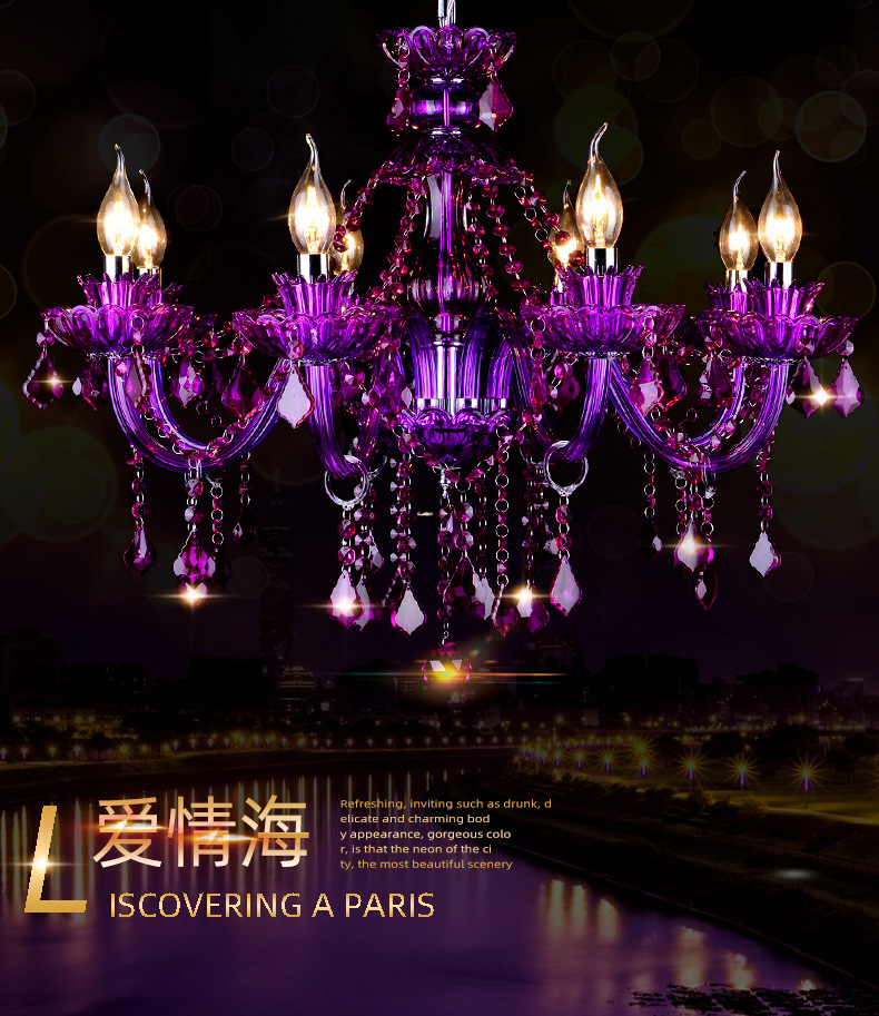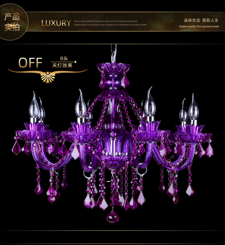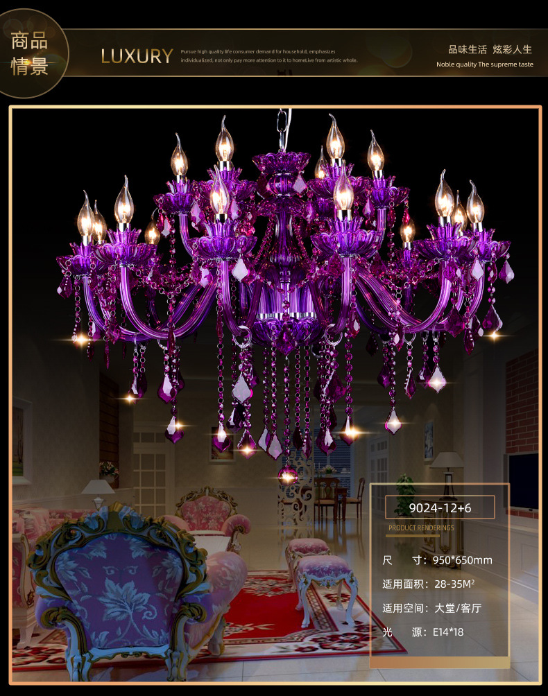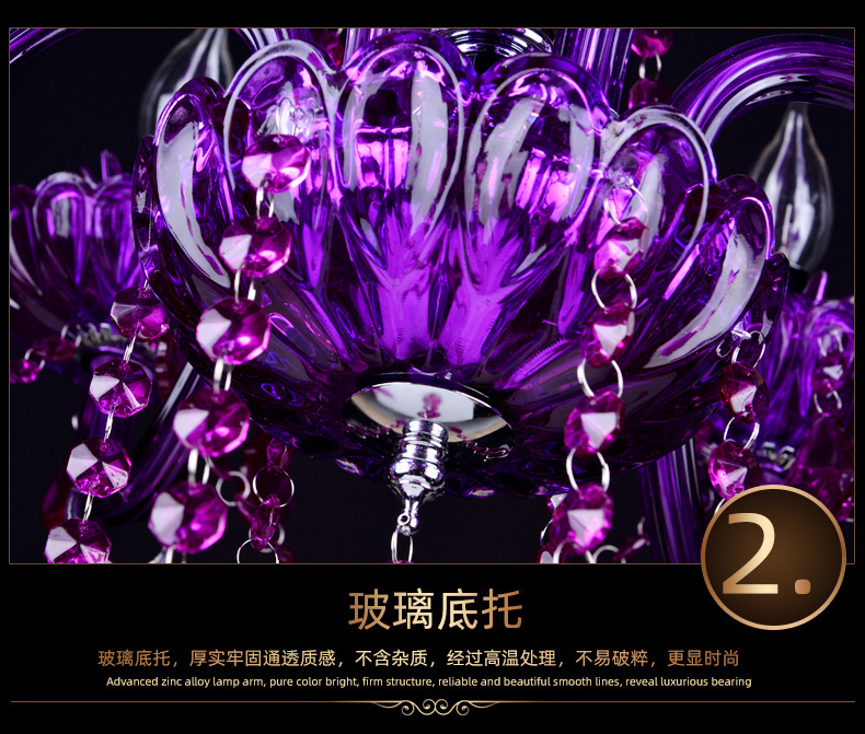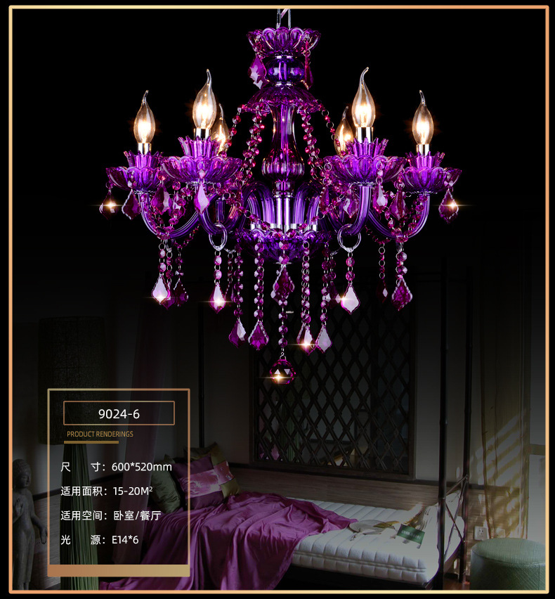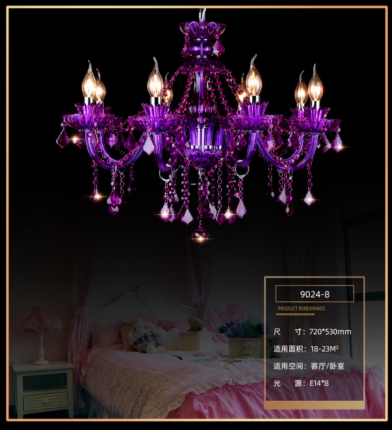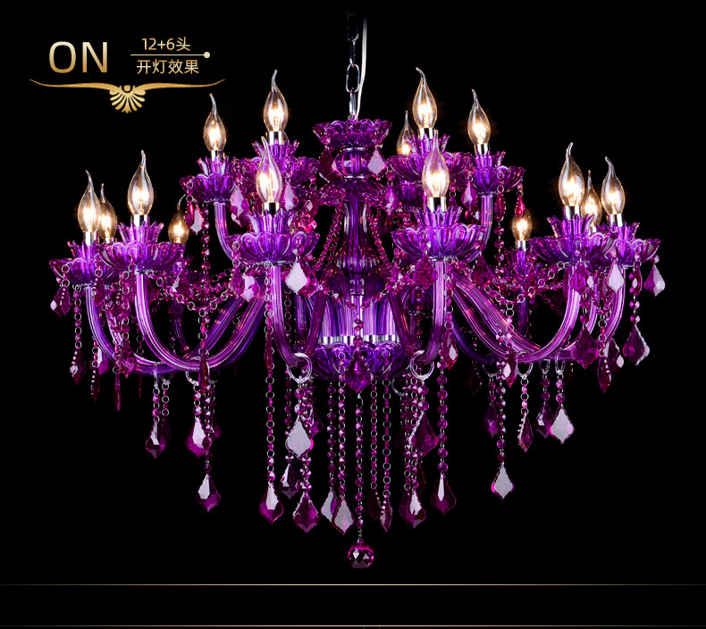 Ce lustre en cristal européen est une expression audacieuse d'opulence classique, remarquable par sa riche structure en cristal pourpre améthyste et sa silhouette spectaculaire à plusieurs bras. Le lustre présente un corps en cristal sculpté aux bras élégamment incurvés, chacun supportant des ampoules de style bougie qui diffusent une douce lumière vers le haut.