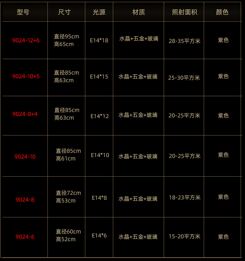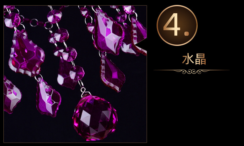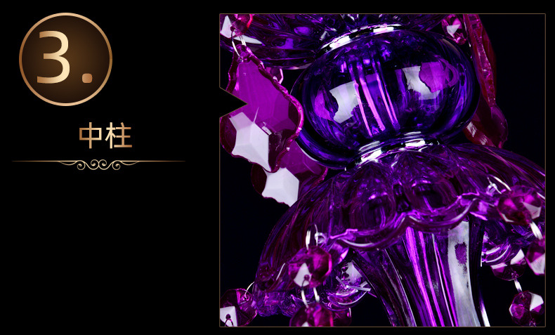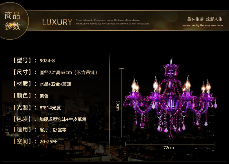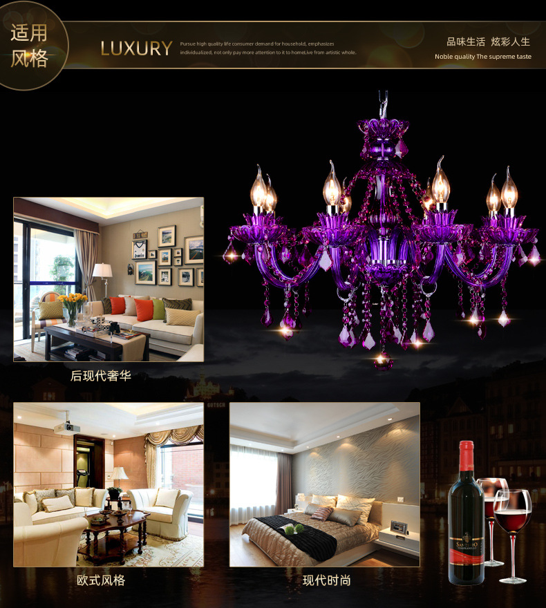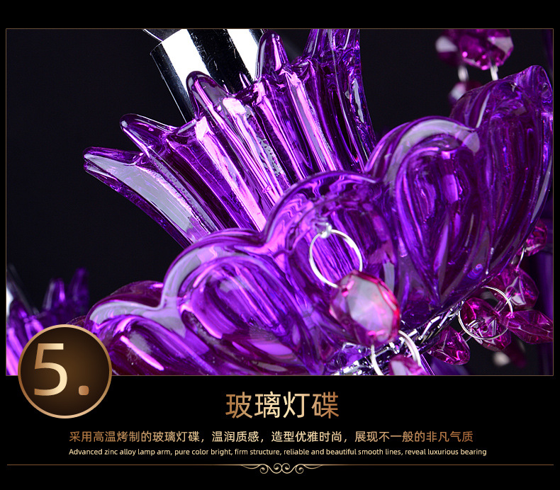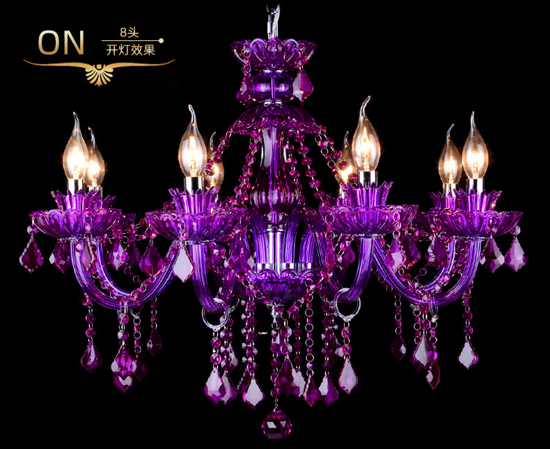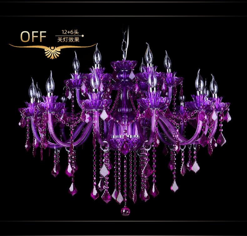 Ce lustre en cristal européen est une expression audacieuse d'opulence classique, remarquable par sa riche structure en cristal pourpre améthyste et sa silhouette spectaculaire à plusieurs bras. Le lustre présente un corps en cristal sculpté aux bras élégamment incurvés, chacun supportant des ampoules de style bougie qui diffusent une douce lumière vers le haut.