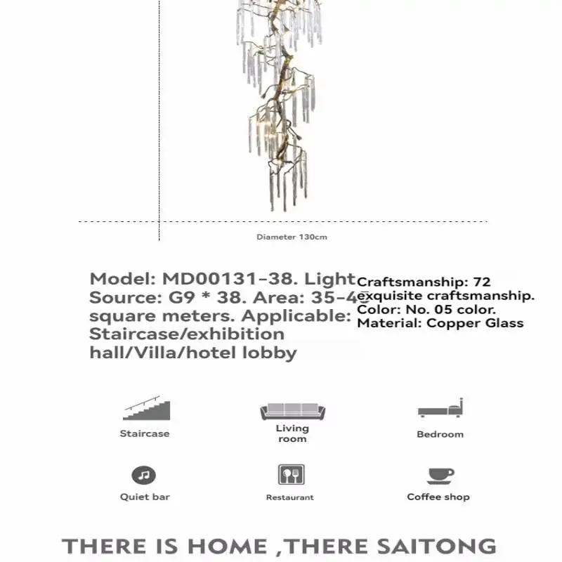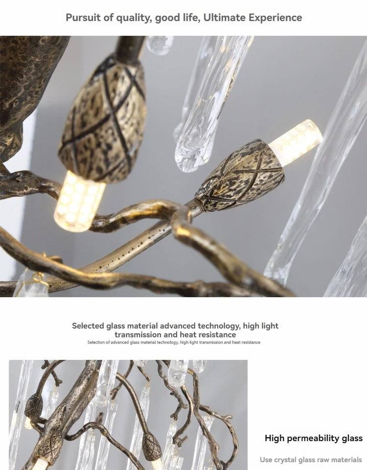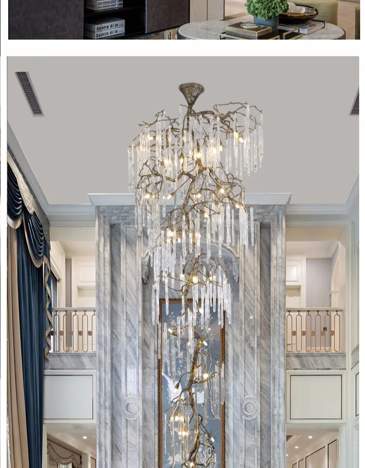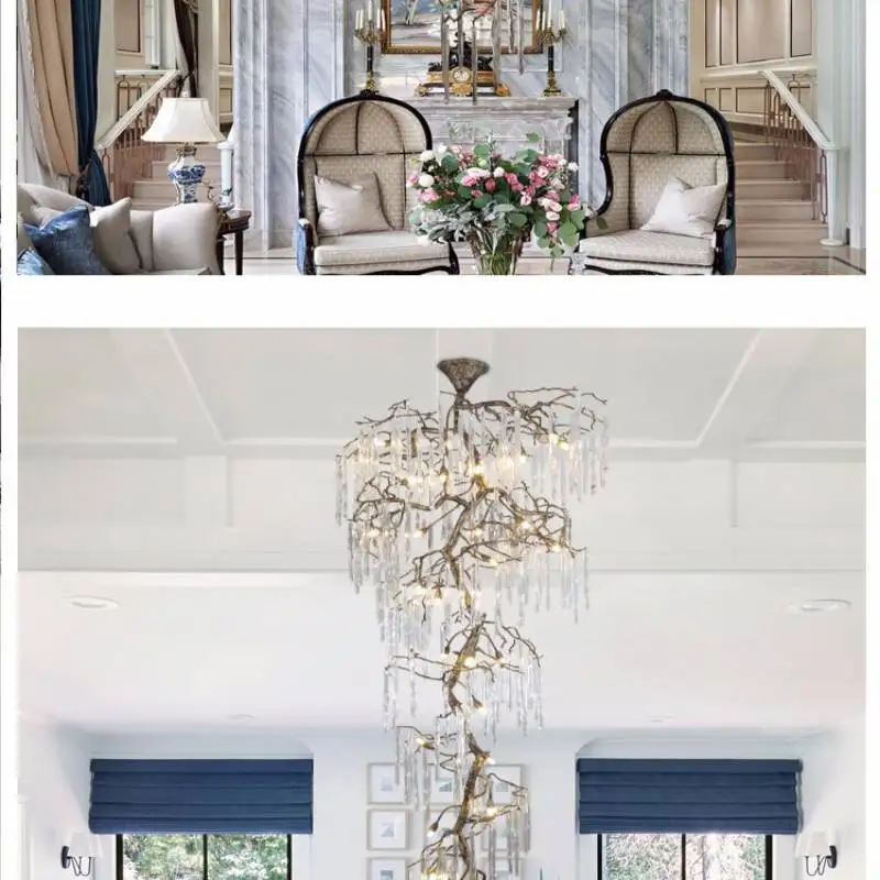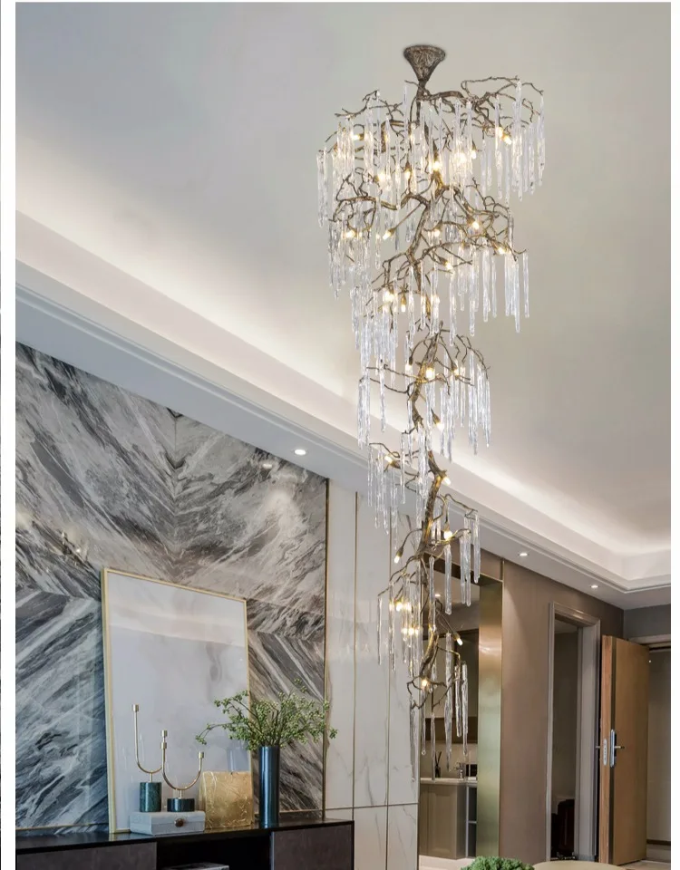 Ce lustre suspendu en cristal de style vintage est conçu pour les escaliers à hauts plafonds et les lofts où un éclairage audacieux est recherché. Sa structure en laiton, inspirée d'une branche, et ses détails en cristal de haute qualité créent une ambiance décorative raffinée tout en illuminant de grands espaces grâce à un éclairage subtil et progressif.