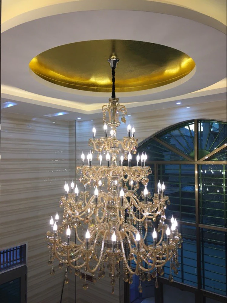 Ce lustre duplex en cristal est conçu pour apporter une touche décorative luxueuse aux intérieurs spacieux. Avec son élégante structure inspirée des bougies et sa conception en cristal ajouré, il crée une ambiance lumineuse et raffinée, idéale pour les salons, les escaliers, les villas et les intérieurs de clubs où un éclairage de plafond d'exception est recherché.