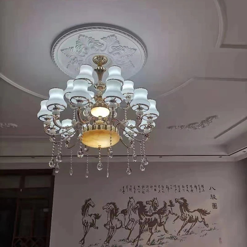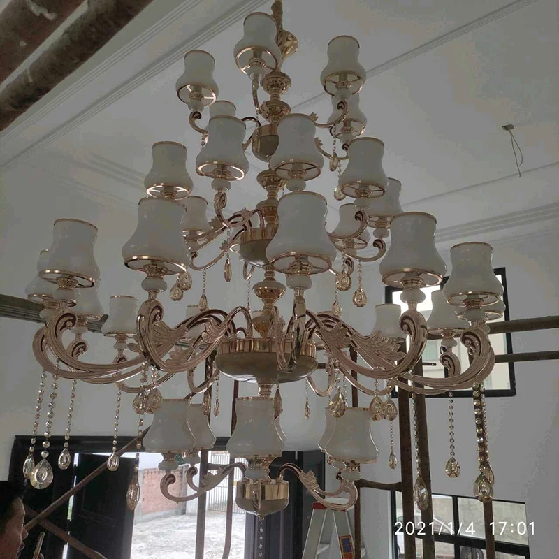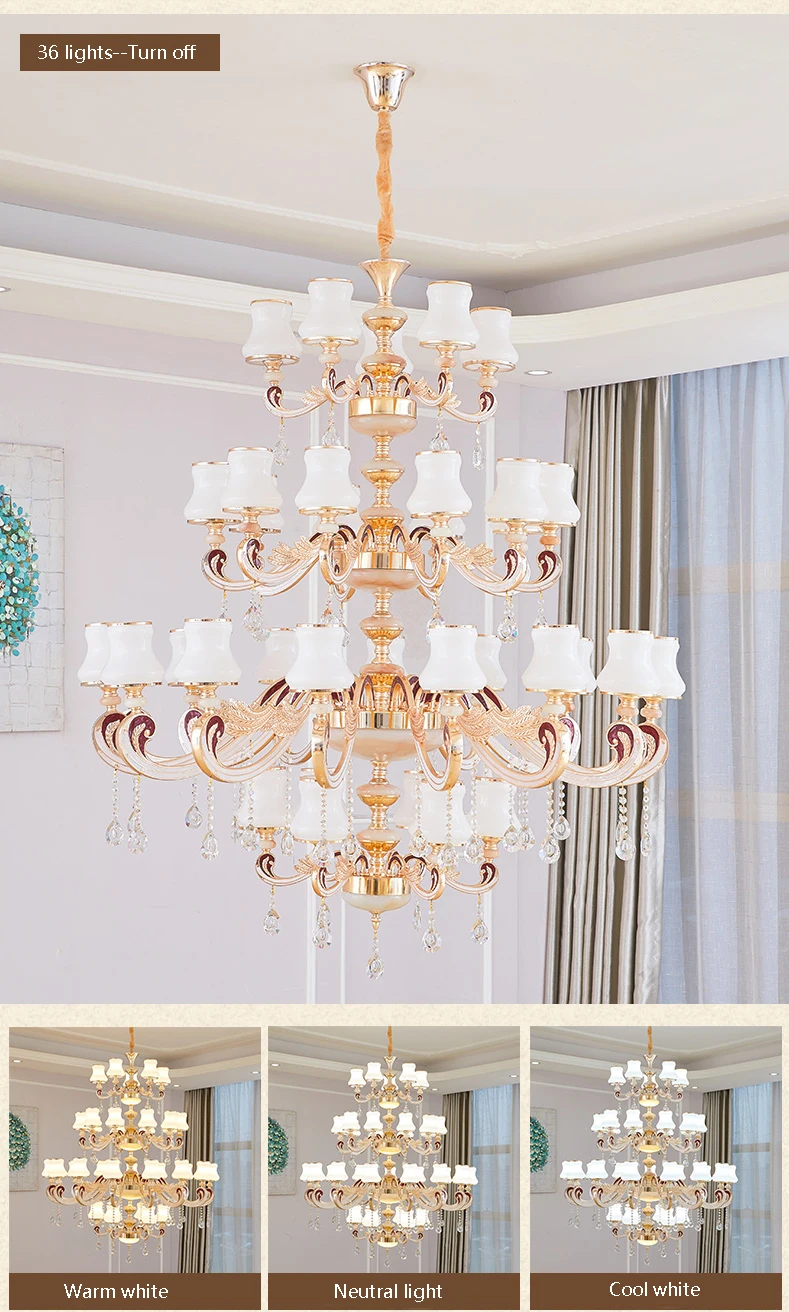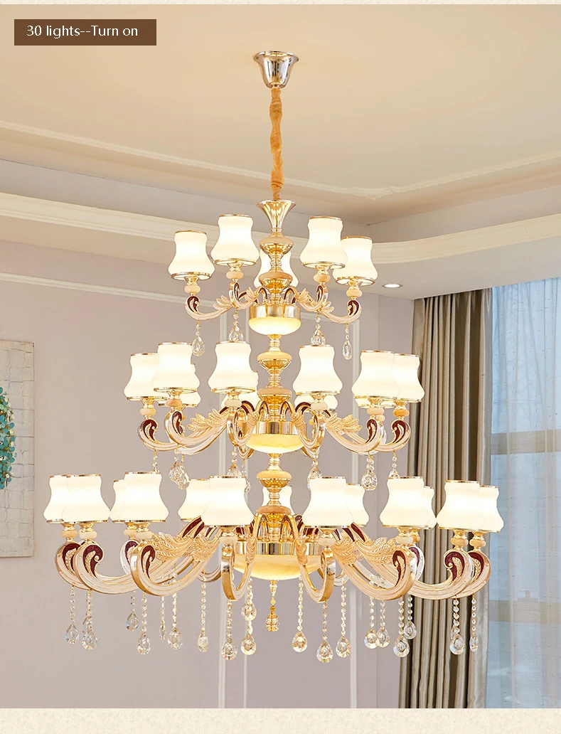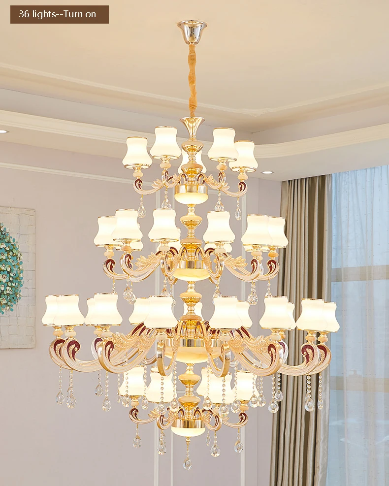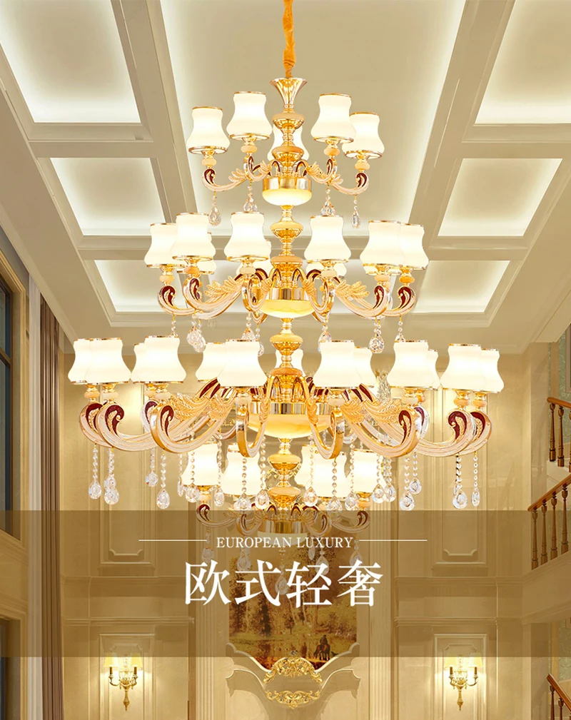 Ce grand lustre en cristal est conçu pour apporter une touche de luxe et de raffinement aux grands espaces intérieurs. Fabriqué en verre de haute qualité et orné de détails en verre dépoli, il diffuse une lumière douce et élégante, sublimant l'atmosphère des salons de villas, des halls d'appartements, des halls d'hôtels et des cages d'escalier.