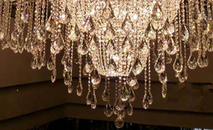 Ce lustre à double rangée de cristaux est conçu pour créer une ambiance luxueuse et feutrée dans les grands espaces. Son design élégant et ajouré, associé à une structure robuste en fer, en fait la pièce maîtresse idéale pour les salons, les halls de villas, les chambres d'hôtels et les pièces à hauts plafonds nécessitant un éclairage décoratif d'exception.