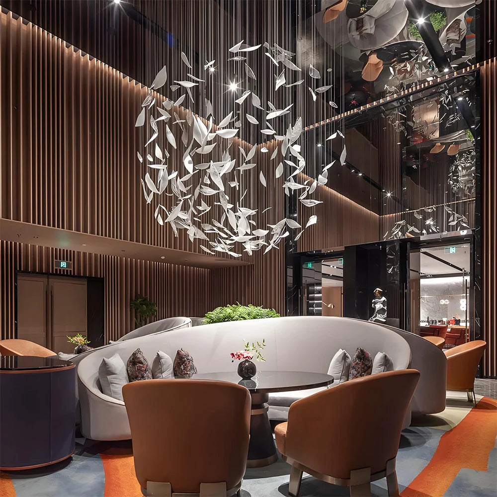 A refined blend of nature-inspired design and modern engineering, this Custom Build Artistic Leaf Chandelier brings sculptural elegance to restaurants, villas, banquet halls, and statement living rooms. The handcrafted glass leaf elements create a layered, organic composition that enhances large interiors with softness and architectural presence. Designed for expansive spaces, each chandelier is meticulously made to order with fully customizable dimensions, finishes, materials, and lighting configurations to align seamlessly with your project vision.